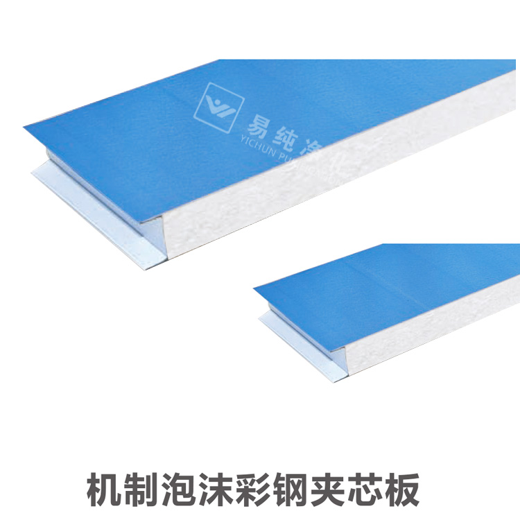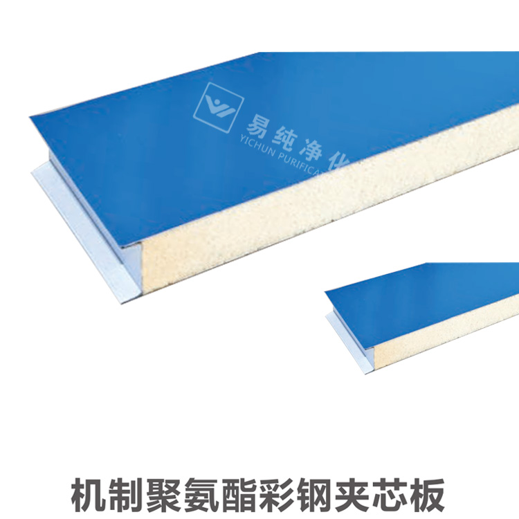 采用聚氨酯PU芯材,热锌彩涂为面层(两层)及高强度粘剂,通过高速连续自动化成型机加温、加压复合,经过修边、开槽、下料而成的新一代建筑装潢板材。