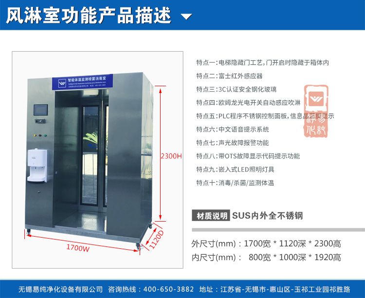技术优势:采用微电脑控制,智能感应消毒,无人值守模式,消毒时间可调,单向和双向消毒,电子门禁功能和温度监控消毒室供用户选择。