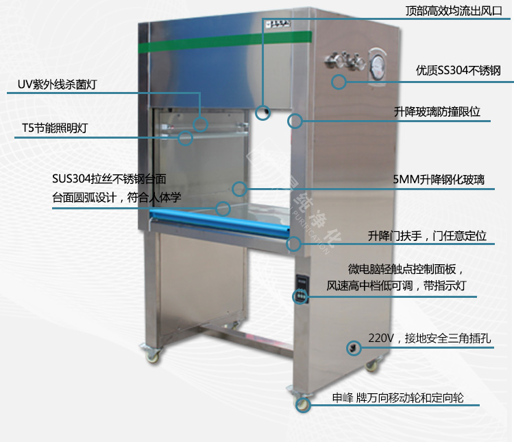 安全可靠的保障措施: 严格按照国际电气安全标准规范设计,确保产品具有多重安全保护措施,采用柔光型的照明灯与紫外线杀菌灯控制单独控制,同时需要注意的是紫外线杀菌只能在工作前开杀菌,在人工作时不允许开紫外线杀菌灯,避免紫外线杀菌灯对人体皮肤造成灼伤。
