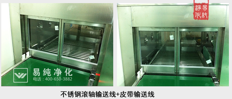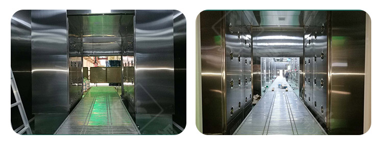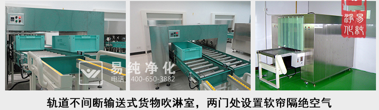 自动输送流水线货淋室是将自动流水线和风淋室相结合的一种产品,可以通过流水线不间断的输送,连续将需要经过的物品表面的灰尘尘埃除尘,其分为有门式,无门式及软帘式,同时为更好的隔绝空气,两端可加风幕机隔绝空气。