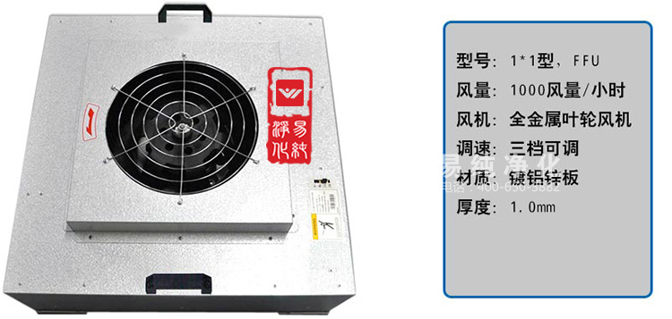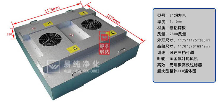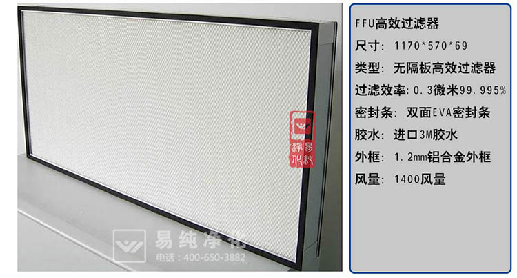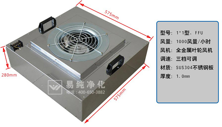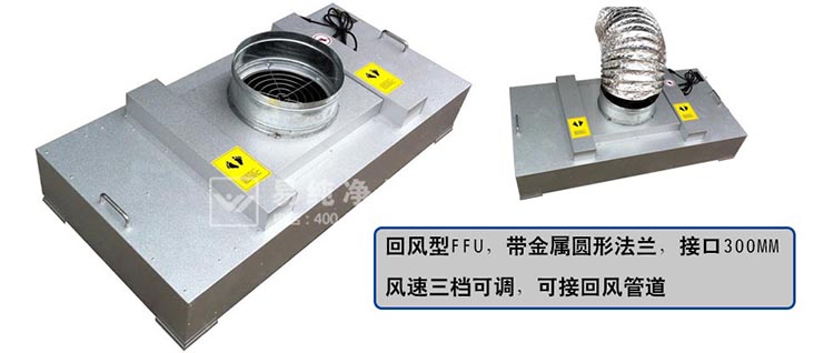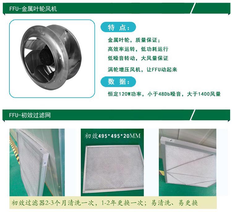 净化过滤:FFU设有初、两级过滤网,0.3微米灰尘过滤效率达到99.995%(钠焰法)。