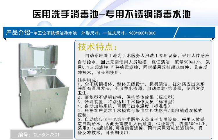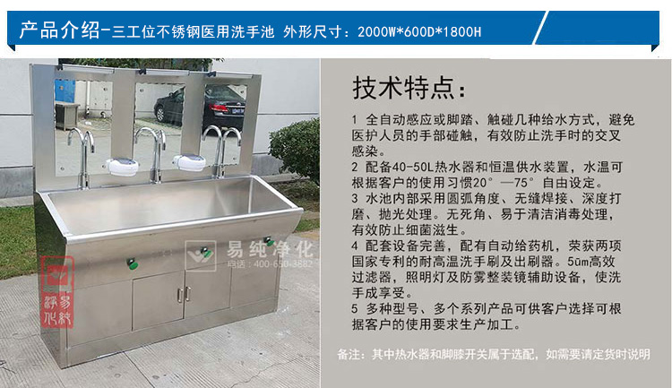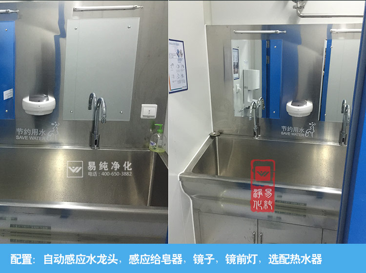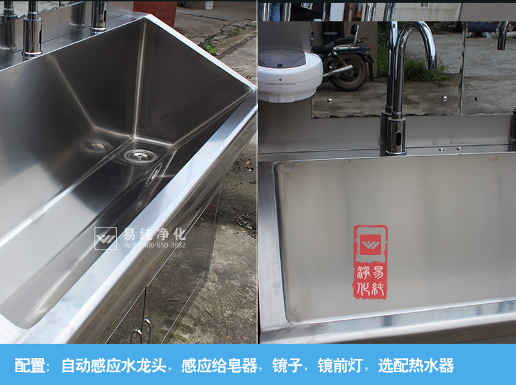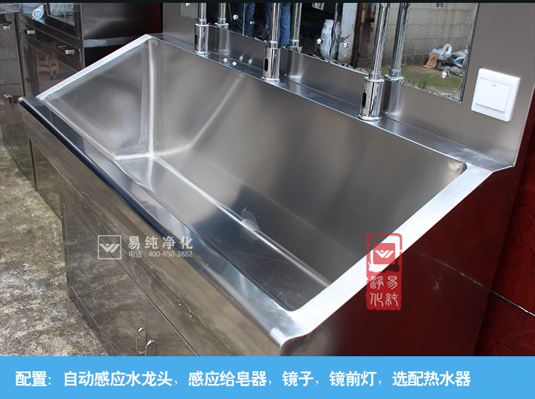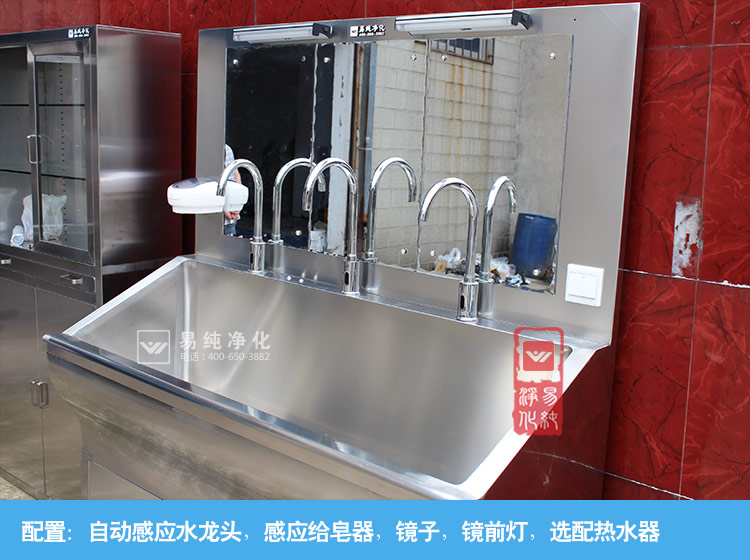 医用不锈钢水池,采用SUS304不锈钢材质制作,配置不锈钢感应水龙头和正衣镜,洗手液。也可根据客户要求定制电加热热水器。